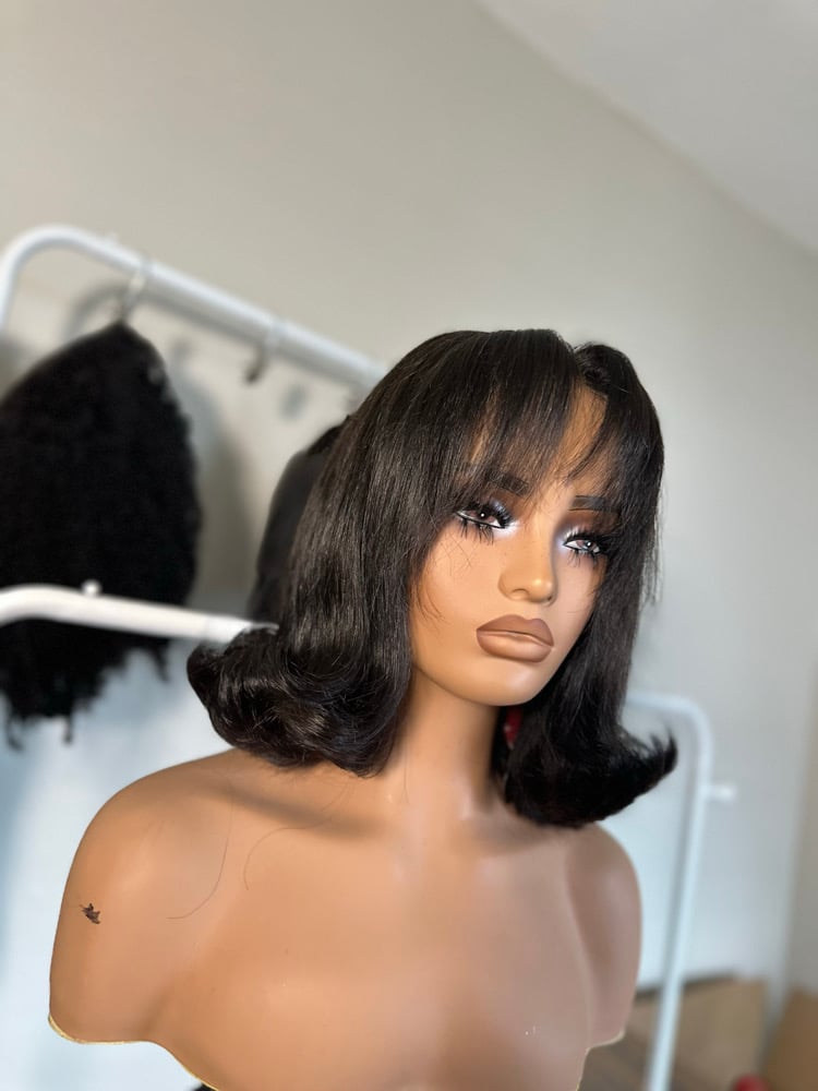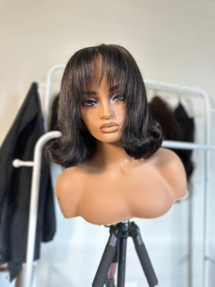 A custom bob designed with light flipped body curls and airy bangs for a timeless, everyday look. This unit frames the face beautifully and gives that “put together without doing too much” energy.